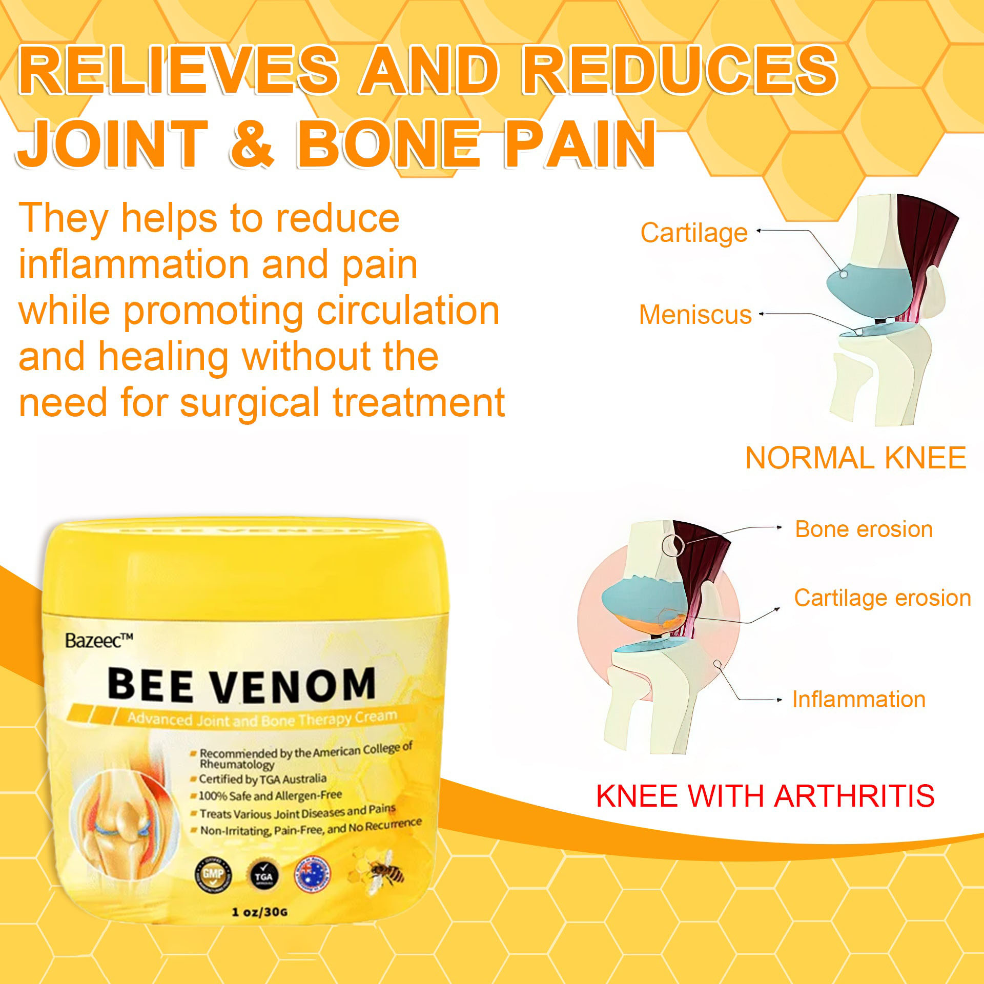 As an orthopedic surgeon, I recommend  Bee Venom Advanced Joint and Bone Therapy Cream to anyone suffering from joint and bone related conditions such as osteoarthritis, rheumatoid arthritis, and other inflammatory diseases. This cream contains active ingredients such as bee venom filtrate, glucosamine and chondroitin. It has the ability to eliminate inflammation, nourish the joints and improve joint mobility. It also helps to rebuild and restore cartilage and bone tissue, reducing pain and stiffness. It also eliminates harmful crystals found in and between joints, restoring normal joints and bones, reducing pain, inflammation and improving joint function.